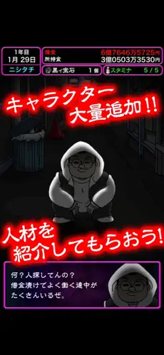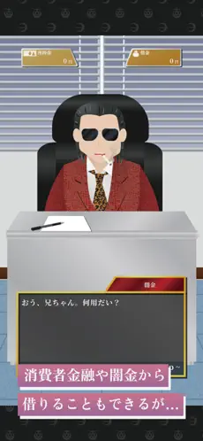面白いポイントは、残業(文字入力ゲーム)や宝くじで稼ぐだけじゃなく、消費者金融や闇金からお金を借りることもできちゃうところ。