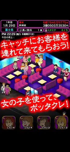 基本無料で遊べるので、課金しなくても十分楽しめません。操作はとてもシンプルで、客引きしてカモを連れてきてキャストにあてがうだけの流れでOKなんです。暇つぶしにサクッと遊ぶのに最適!電車の中や待ち時間でもちょっとずつ進められる便利さがあります。