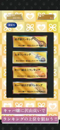 ランキングシステムも面白いんです。貢ぎ額・太客・キャバ嬢売上・キャバ嬢貢ぎ額の4種類のランキングがあって、他のプレイヤーと競争できるんですよ。友達と一緒に「誰が一番太っ腹か」勝負するのも盛り上がります!上位を目指すのも夢中になれるポイント!
