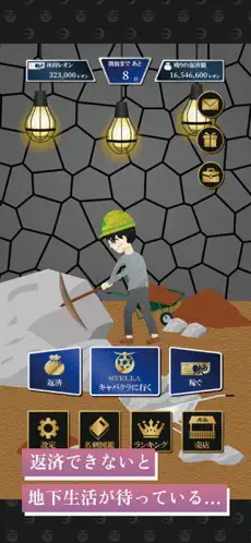 このアプリのヤバいところは借金システムです。消費者金融や闇金からお金を借りて推しキャバ嬢に貢げるんですが、返せないと地下労働施設送りになるリスクがあります。地下モードに突入すると通常とは違うキャバクラ体験ができるので、ギャンブル感覚でハラハラドキドキ楽しめます!